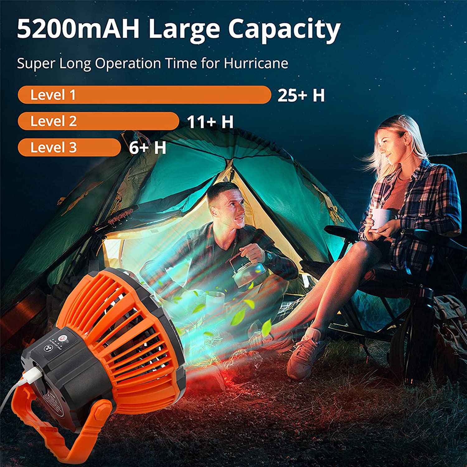 5200mAh Battery & 6-25H Working Time:This fan with battery rechargeable has a 5200mAh battery capacity,which can be used as an emergency power source to charge mobile phones, GPS, MP3 or iPod, etc.What’s more?fully charging in 6-8 hours, working 6-25 hours,It was born for camping.